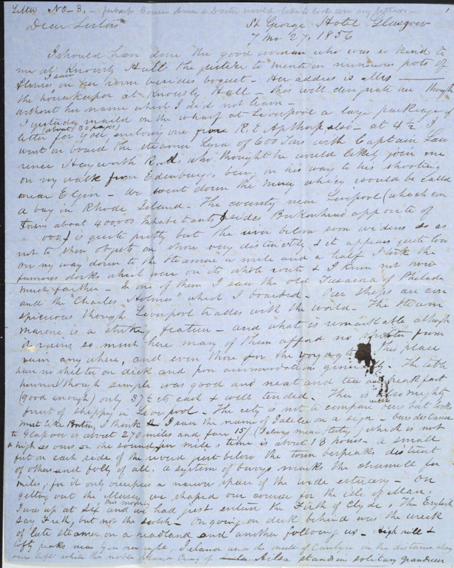 In this letter to his sisters, Joseph Peace Hazard writes from the St. George Hotel in Glasgow about his travels to and in Scotland. Topics include the islands to the southwest of Scotland and northern Wales and the rivers, mountains, and lakes of Scotland.