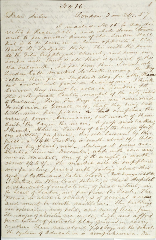 In this travel letter to his sisters, Joseph Peace Hazard writes about his time in London. Topics include a trip to the market; social ongoings; a seance; a walk in Hampstead Heath and Hainault Forest; and a trip to The Royal Institution.