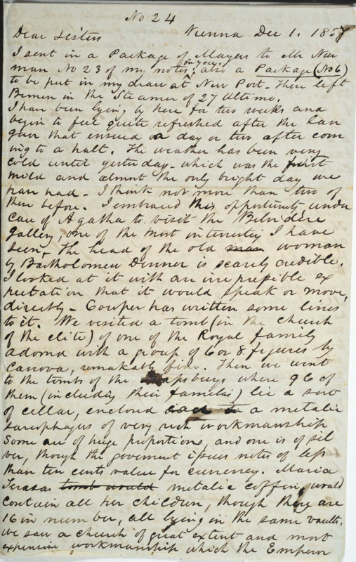In this letter to his sisters, Joseph Peace Hazard writes about his travels in Austria, Romania, Bulgaria, and Turkey. Topics include a visit to the Belvedere Gallery in Vienna; social calls; local customs; a visit to a mosque in Istanbul; and the geography, flora, and fauna he observed.