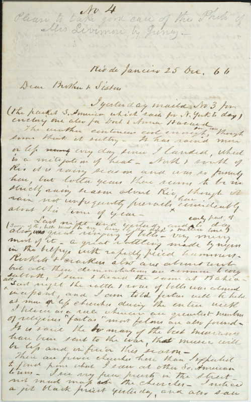 In this letter to his brother and sisters, Joseph Peace Hazard writes from Rio de Janeiro about his travels in South America. Topics include the prevalence and importance of churches; a visit to James Monroe, U.S. Consul in Rio (and former Congressman from Ohio); visits to the Botanic Garden; the flora and fauna he observed; local customs; and the houses and villas he saw.