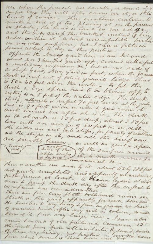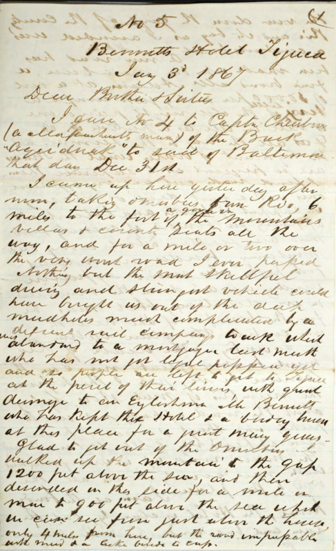 In this letter to his brother and sisters, Joseph Peace Hazard writes from Tijuca neighborhood of Rio about his travels in Brazil. Topics include the local waterfall; chats with the owner of the hotel (a Mr. Bennett) and other social calls; the process of shoeing mules; and a visit to the Imperial Palace [Museum] in Petrópolis.